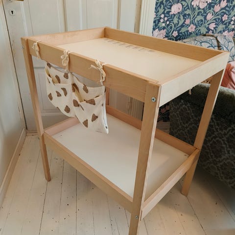 Ostettu ikeasta. Alunperin käytetty vauvan hoitopöytänä ja myöhemmin "koulupöytänä". Työtasoa saa nostettua ja laskettua. Edessä parissa vetolaatikossa kynän piirtojälkiä ja sivulla pieni naarmu (näkyy kuvissa). Muuten kunto hyvä.
