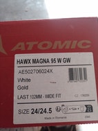 Atomic Magna 95 W laskettelumonot, väri valkoinen. Monoilla laskettu muutama lasku, jonka jälkeen tyttö totesi ne pieniksi. Ovat uuden veroiset. Sisävuori on ihanan pehmeä ja lämpöä eristävä.