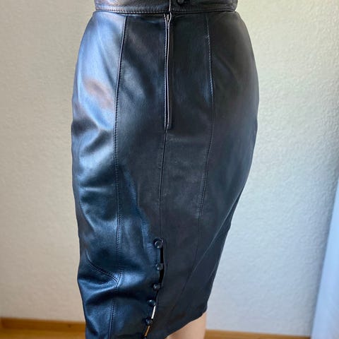 Mittatilaustyönä tehty hame suoraan 90-luvulta. Laadukasta mokkaa pehmeää mokkanahkaa. Boutique Bigarre edelleen Helsingin keskustassa.