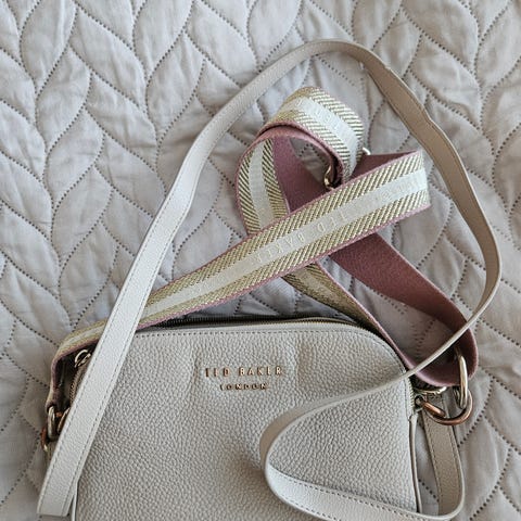 Ted Baker Nahka Olkalaukku naisille, valkoinen väri ja kukkakuviointi. Laukussa on useita taskuja ja vetoketjullinen osio. Materiaali on nahkaa ja se sopii päivittäiseen käyttöön.
