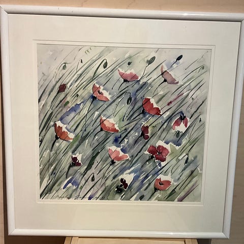 Aarne Lammisen herkkä ja kaunis kukka-akvarelli vuodelta 1936. Kehyksen koko: 40cm x 34cm. Kehystetty ja lasin alla.