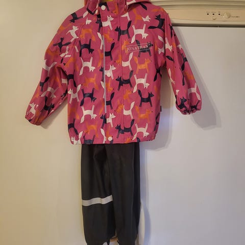 Jonathan sadetakki, 98. Uutena ostettu, yhden käyttämä. HcOutwear sadehousut, useamman käyttämät. Otin jalkalenksyt pois, koska olivat jo kuluneet. Napit on lenksuille. Nämäkin vielä oikein ok seuraavalle käyttäjälle.