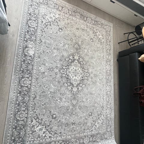 IKEAN vaaleanharmaa matto. Kunto on hyvä, saattaa näkyä joitakin pieniä käytön jälkiä. (Ks. viimeinen kuva) Helppo kuitenkin peittää esimerkiksi sohvan alle/taakse. :)