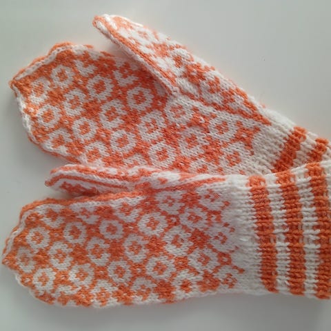 Kahdet lapaset, peukalo n. 3 cm ja peukalon tyvestä kärkeen n. 8 cm.