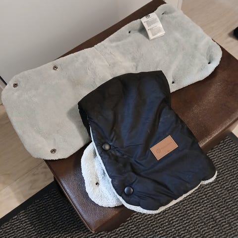 Lodger käsienlämmitin rattaisiin. Uutena ostettu. Muuten hyväkuntoinen mutta yhden napin kohdalta kangas revennyt. Napin saa silti kiinni, ei ole vaikuttanut käyttöön eikä repeämä näy kun lämmittimen laittaa aisaan kiinni.