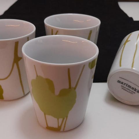 Marimekko Poimulehti muki. Suunnittelija Erja Hirvi v. 2006. Korkeus 8cm, vetoisuus 2,35dl. Ei vikoja.