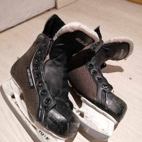 Bauer jääkiekon luistimet, koko 12EE. Väri musta ja valkoinen. Soveltuvat jääkiekon harrastamiseen ja pelaamiseen. Luistimissa on nauhoitus ja niissä on jäähän sopivat terät.