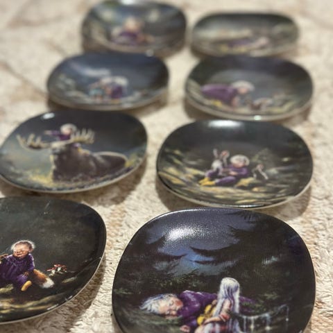 Arabia Sydänystävä -seinälautaset 1 ja 2, Lintu ja Karhu. Alkuperäiset laatikot ja tarinat mukana. Hinta 18 € / kappale tai molemmat yhteensä 30 €.