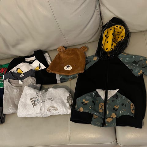 Ylärivi 92 koossa ja alarivi 98 koossa. Harmaa ja eläinkuosinen oikealta ovat mekkoja. Vihreäpohjainen kukkapaita on pitempi paituli. Kaikki siistejä/ehjiä. Koiratalous.