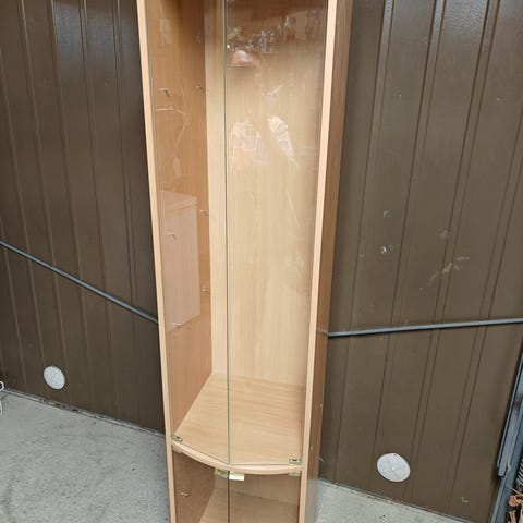 Etsinnässä valkoinen vitriini jossa olisi myös veto laatikoita alhaalla.