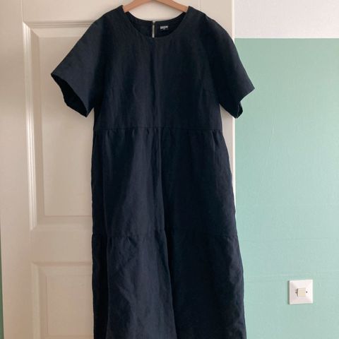 Milja-kietaisumekko, 100% pellavaa, paksua, ei näy läpi ainakaan normaalissa päivänvalossa. Sivusaumoissa taskut.
