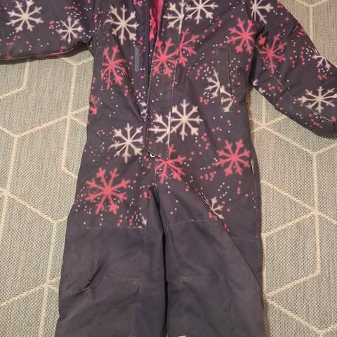 Haalari on hyvässä kunnossa, mutta kulumajälkiä näkyy edessä ja takana. Haalarin lahkeista on irronnut heijastin nauhat. Polvessa on pieni paikkaus.