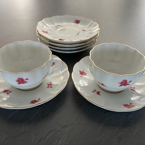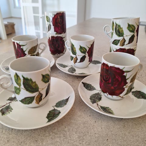 Arabia punainen ruusu. 6 kpl kahvikuppeja, 11 kpl aluslautasia ja 9 kpl leivoslautasia. Kultaukset osittain kuluneet. Pohjaleimat vaihtelevia. Tarjouksia otetaan vastaan!