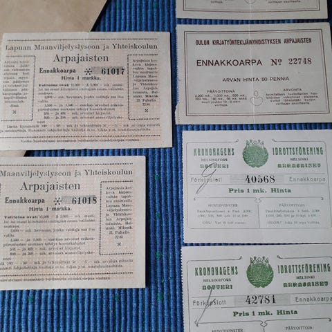 Töölön Yhteiskoulu 1 markka/ 2 kpl. Hämeenlinnan Nuorsuomalaisten yhdistys 50 penniä/4kpl. Yht.hinta 12 €