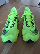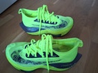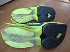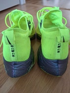 Niken hiilikuitulevyllä varustetut miesten erittäin kevyet juoksukengät, joila juostu tarkalleen 162,9 km pelkästään kisoissa. Kengissä näkyy kilometrimäärää vastaavia kulumia.