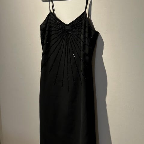Lyhythihainen, musta, hyvin istuva mekko. Takana vetoketju.