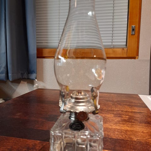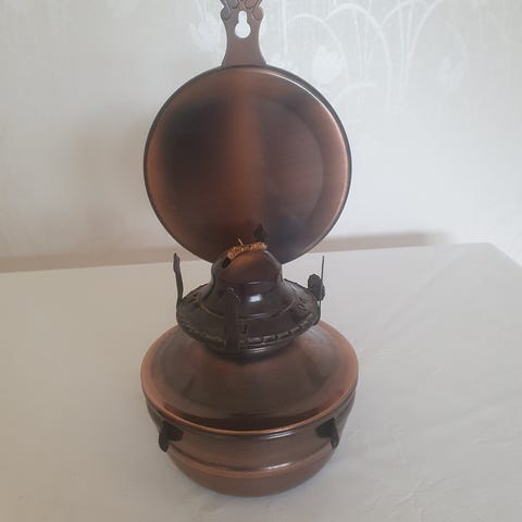 Messinkinen lampukka. Ruskea öljykuppi ja sydänlanka lamppuöljyä varten.