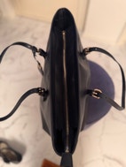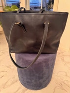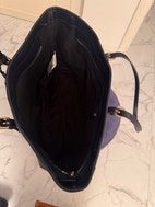 Laukku on tummansininen ja se on valmistettu tekonahasta. Vetoketjullinen yläosa.
