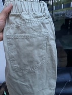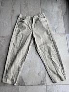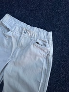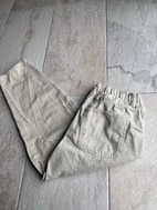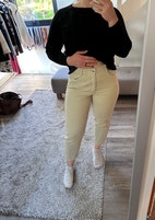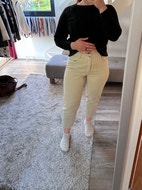 H&M vaaleanvihreät farkut. Koko 40, vastaa enemmänkin M kokoa. Kuvassa L kokoisen päällä liian naftina