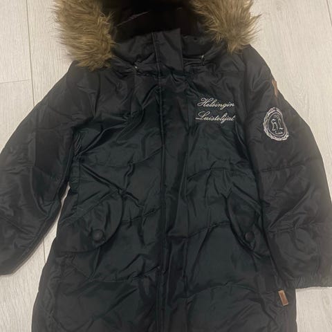 Reiman talvitakki, sinisellä pohjalla valkoisia sydämiä ja palloja. Hieman jo kulumaa mm. saumoissa, mutta mielestäni vielä kelpo takki käyttöön.