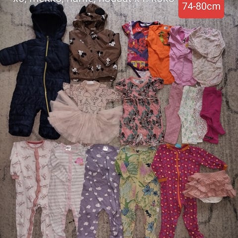 Myydään yhdellä tytöllä vähän käytetty,osa käyttämättömiä vaatepaketti. Sisältää 5kpl paita-housu settejä,9kpl housuja,8kpl paitoja,fleecehaalari,kollari haalari ja ns.kollari takki. Hajusteettomalla pesty,ei eläimiä taloudessa. Koot 74-80. PAKETTIIN LISÄTTY 4kpl housuja.