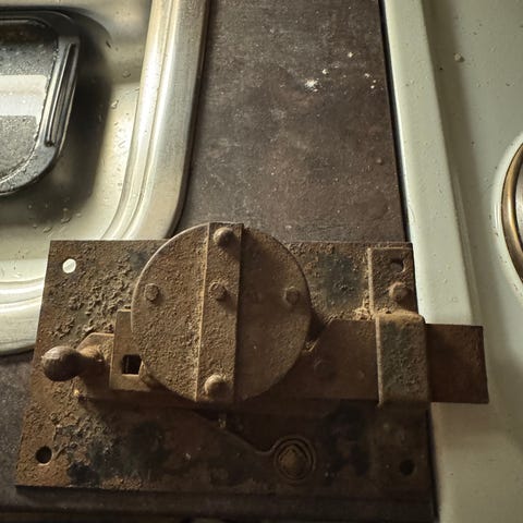Myydään vanha pintalukko, avain ja avainkilpi.