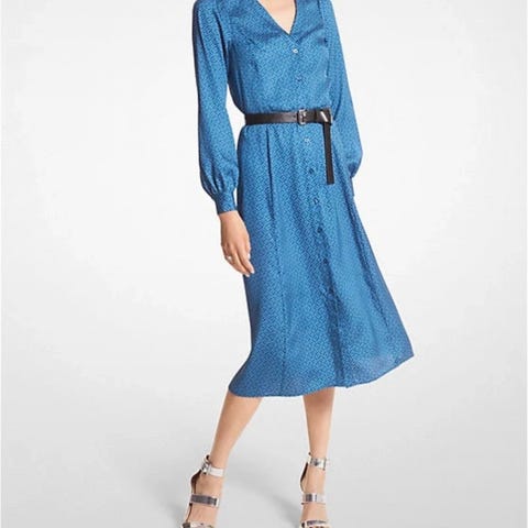 Siniraidallinen Michael Kors mekko. Edessä piilonapitus ja sivuilla taskut, jotka vielä avaamatta. Puuvillaa, alushame polyesteriä sekä elastaania, joten joustaa. Koko 6, vastaa kokoa 36-38.