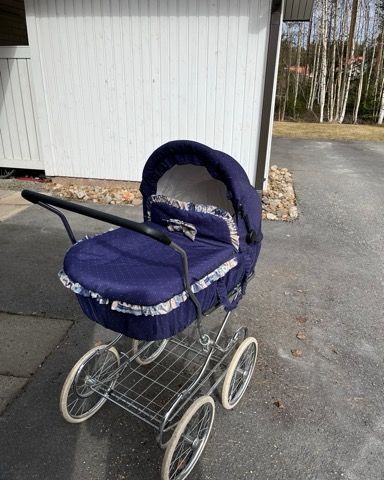 Emmaljunga lastenvaunut, joissa sininen kangas ja raidallinen kuosi.pestävät ja irrotettavat. Vaunuissa on uudet isot pyörät. Tavara teline vaunun alla.