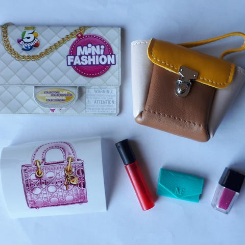 Mini Fashion setistä laadukas nahkalaukku nukelle, lisäksi avautuvat aurinkolasit, huulikiilto, sekä muutama muu minibrands juttu kaupan päälle.