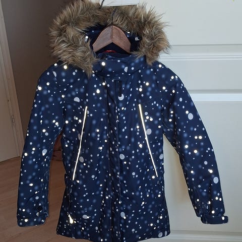 Hupussa lämmin vuori ja karvareunus. Hupun saa irti. Edessä taskuja ja vyötäröllä kiristysnauha. Takaa helma vähän pidempi kuin edestä.