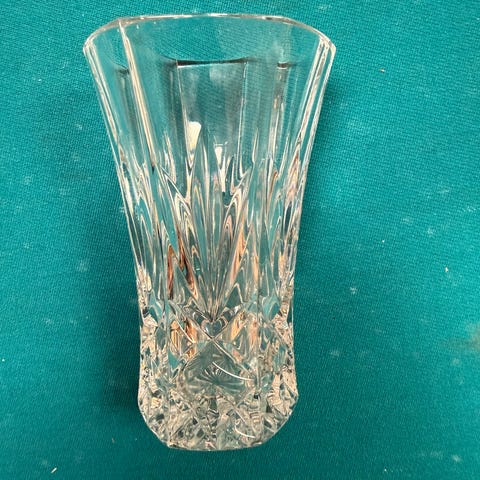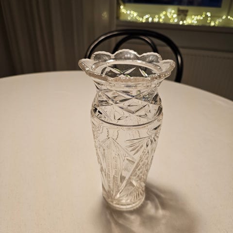 Kaunis kristallimaljakko. Korkeus 20 cm. Paino 1.5 kg.