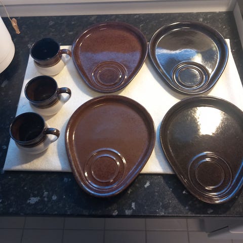 Käyttämättömät Kerman Savi astiat.4 kahvikuppia,3 aamiaiskulhoa,sokerikko,kermakko.Katsoithan muutkin ilmoitukseni.