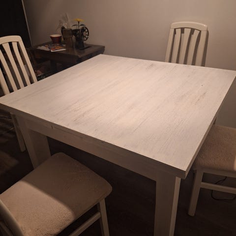 Hyväkuntoinen ruokailupöytä 6-hengelle. Väri valkoinen/tumma pähkinä. Käyttöjälkiä on.