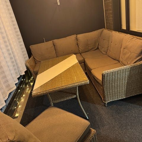 Rottinki oleskeluryhmä sisältää L-mallisen sohvarymnän, lasipintaisen pöydän ja kaksi jakkaraa.