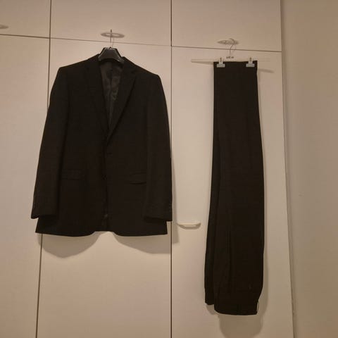 Hyväkuntoinen harmaa puku, takki 54 ja housut W36L30. Nouto Parainen.
