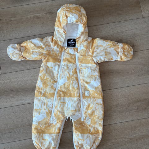 Hihat saa halutessaan taitettua, jotta pikku kädet pysyvät lämpöisinä. Haalarin saa myös pussiksi lahkeiden vetoketjujen ja neppareiden avulla.