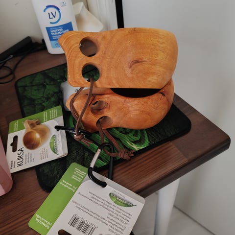 Kuksat, kestävää puuta. Helppo kiinnittää vyölle tai reppuun. Myydään settinä.