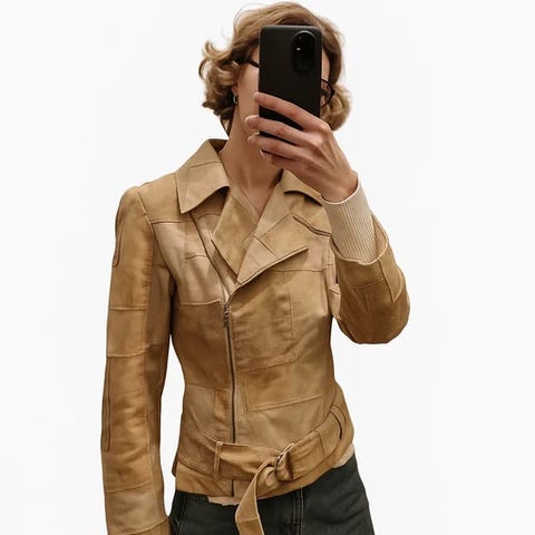 Mittatilaustyönä tehty asu suoraan 90-luvulta. Laadukasta pehmeää nahkaa/mokkaa. Boutique Bigarre edelleen Helsingin keskustassa.
