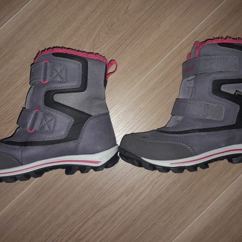 Siistit yhden talven käytössä olleet talvikengät. Tummanharmaa mustat, kuva muuttaa jotenkin violetin sävyiseksi, jota eivät ole. Vuori hieman nukkaantunut, muuta sanomista ei ole. Sisämitta 23cm.