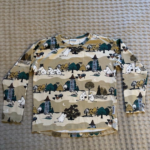 Vähäisellä käytöllä ollut laadukas muumipaita.paidassa oleva muumikuva ei ole kulunut ollenkaan eikä paidan väri ole juuri haalennutkaan. Siisti paita.
