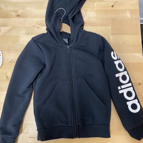 Adidas lasten huppari, koko 128, musta väri. Unisex-malli, valmistettu pehmeästä materiaalista. Hupparissa on vetoketju edessä ja ikoniset Adidas-raidat hihoissa.