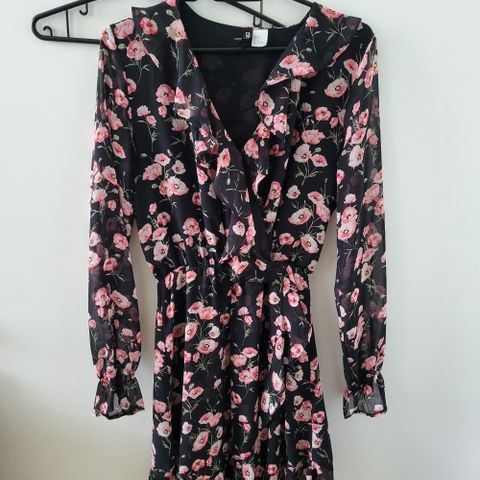 Muutamia kertoja käytetty. Takana solmimisnauha. Mustalla pohjalla kukkia.
