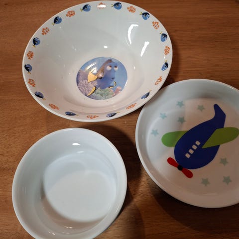 Myydään 3 kpl lasten lautasia. Kaksi matalaa lautasta ja yksi syvempi.