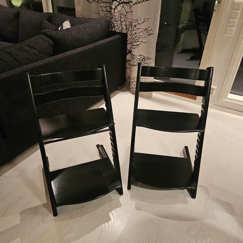 Stokken Tripp Trapp lasten tuoli. Väri violetti/luumu. Yleisilmeeltään siisti, mutta käytönjälkiä näkyy maalipinnassa. Ks. kaikki kuvat.