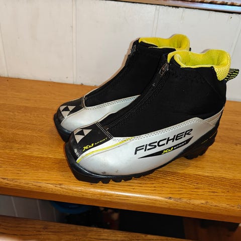 Fischer lasten hiihtokengät, koko 32. Värit musta ja keltainen. Pohjassa on SNS Pro -kiinnitysjärjestelmä.