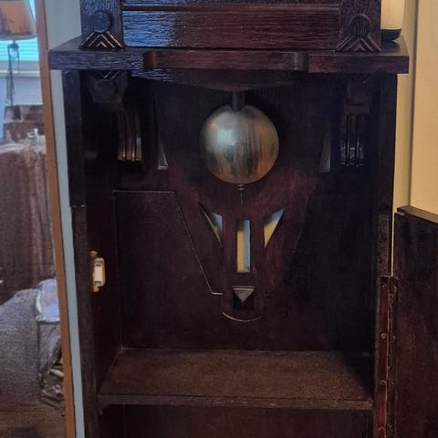 Hieno puinen kaappikello. Tikittää. Lyö tasatunteja. Vedetään avaimella muutaman kerran viikossa. Ei ole nyt pariin vuoteen kunnilla toiminut. Käy kyllä, saattaa jättää. Lyö tasatunteja, mutta vaisusti. ( Toisaalta hyvä korville, ettei kaikkia tunteja lyö, eikä äänekkäästi, vaan maltilla) Kelloseppä on sitä aikanaan korjaillut. Hieno sisustuksellisestikin. Koko 56x30. Syvyys 14