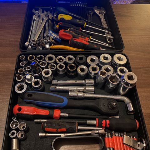 Lajittelu laatikossa jossa kantokahva on rakennus- ja remonttitarvikkeita: ruuveja, nauloja, proppuja, kuusiokoloavaimia, puutappeja ja muita kiinnikkeitä ym.