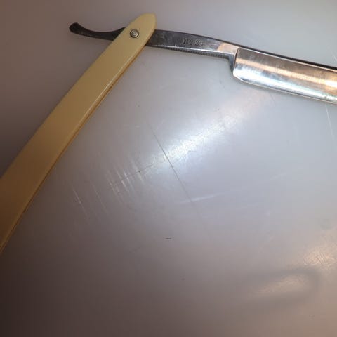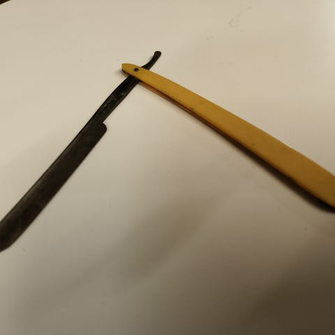 Vanha partaveitsi alkuperäisessä pahvikotelossaan.