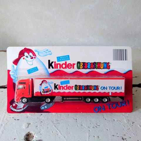 Kolmeosainen punainen junasetti, alkuperäinen Kinder-yllätyslelu 1980-luvun lopulta. Osat yhdistyvät toimivalla magneettikiinnityksellä, joka on tyypillinen Kinderin varhaisille junasarjoille.