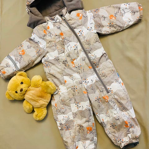 Lassie toppqhaalari koko 86cm. Polvissa ja pyllyssä kulumaa lahkeessa pieni reikä. Hupun karvareunus puuttuu. Meillä toimi hyvin kakkoshaalarina.
